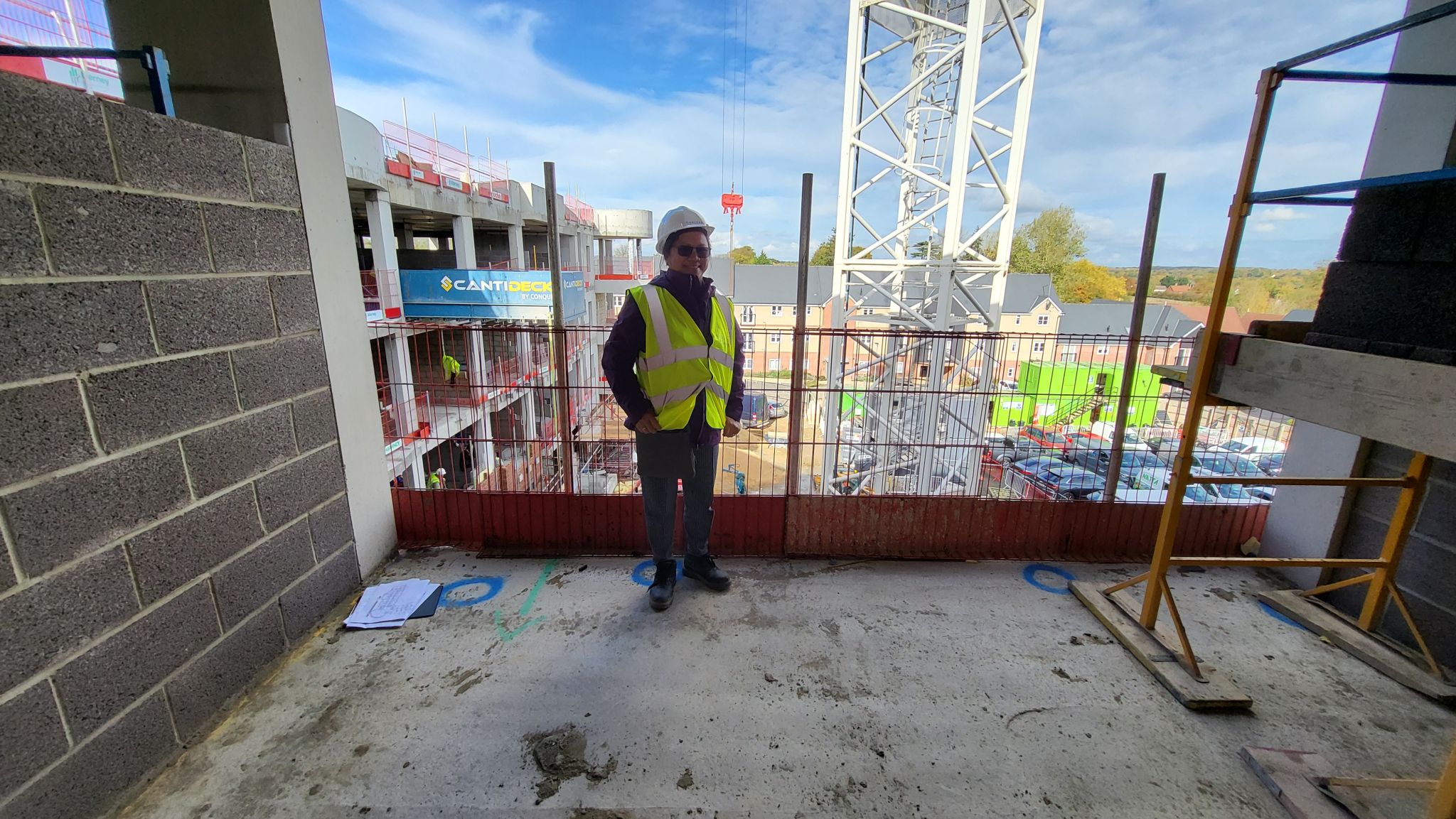 A site inspection in Essex for Gigi Mahor shows the scaffolding has been set up and the bricklayers are now working at 1st floor level. All internal walls are almost complete and the ventilation system throughout the building is nearing the end of installation. A crane onsite is always a highlight and the Cantideck was a dream!